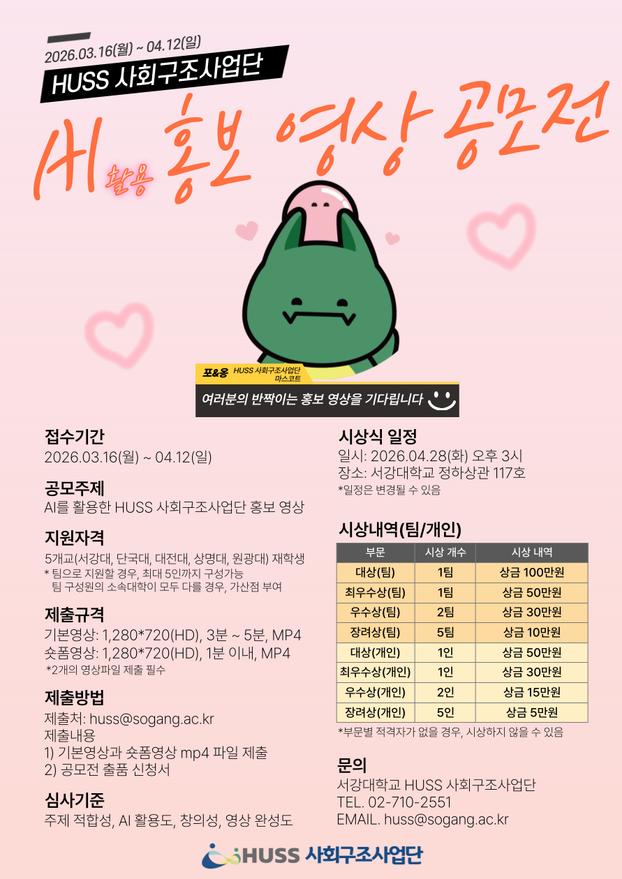인문사회 융합인재양성사업(HUSS) 사회구조사업단에서는 ‘HUSS 사회구조사업단 AI 활용 홍보 영상 공모전’을 아래와 같이 개최합니다.