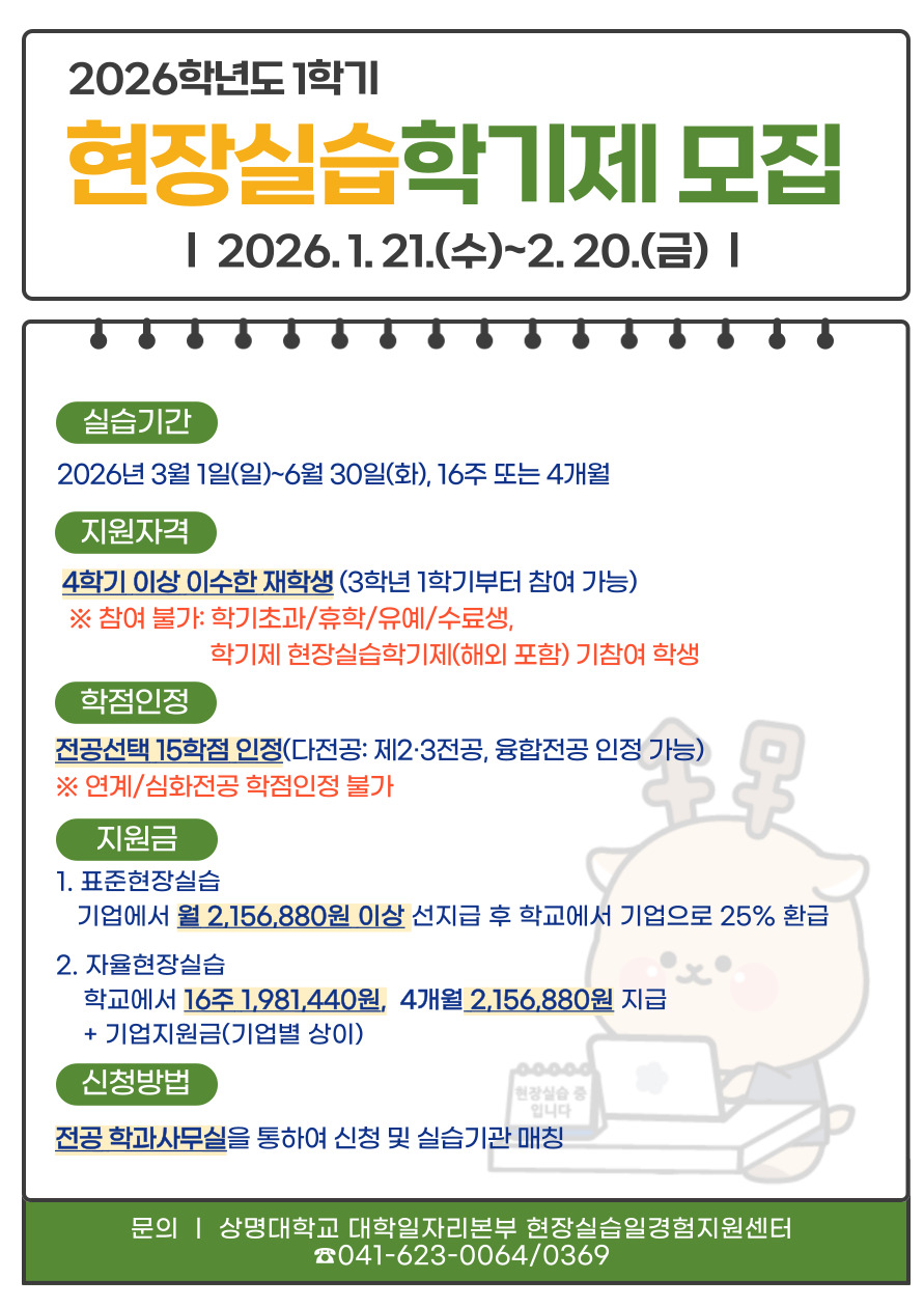 천안 [진로취업] [현장실습·일경험지원팀] 2026학년도 1학기 현장실습학기제 시행 공고 -